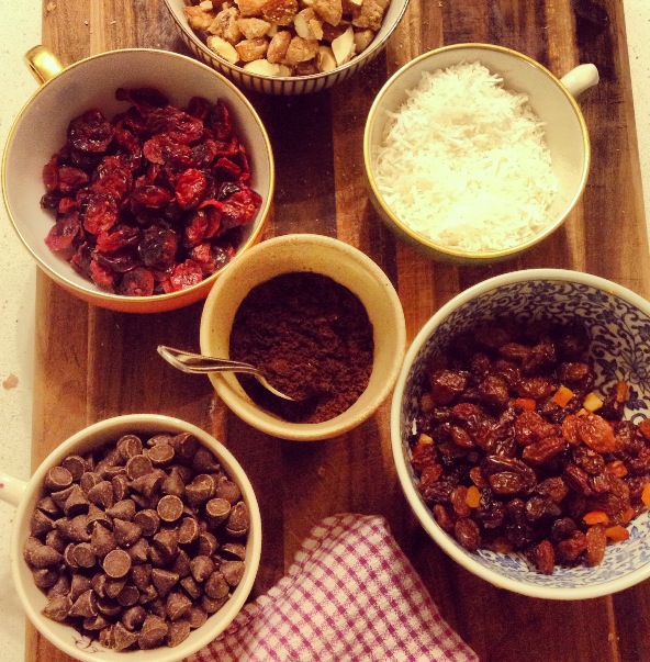 1 + 1/4 cups ‘stuff’ – I used craisins, dark-chocolate chips, desiccated coconut, candied almonds, and mixed dried fruit (raisins, sultanas, citrus peel)