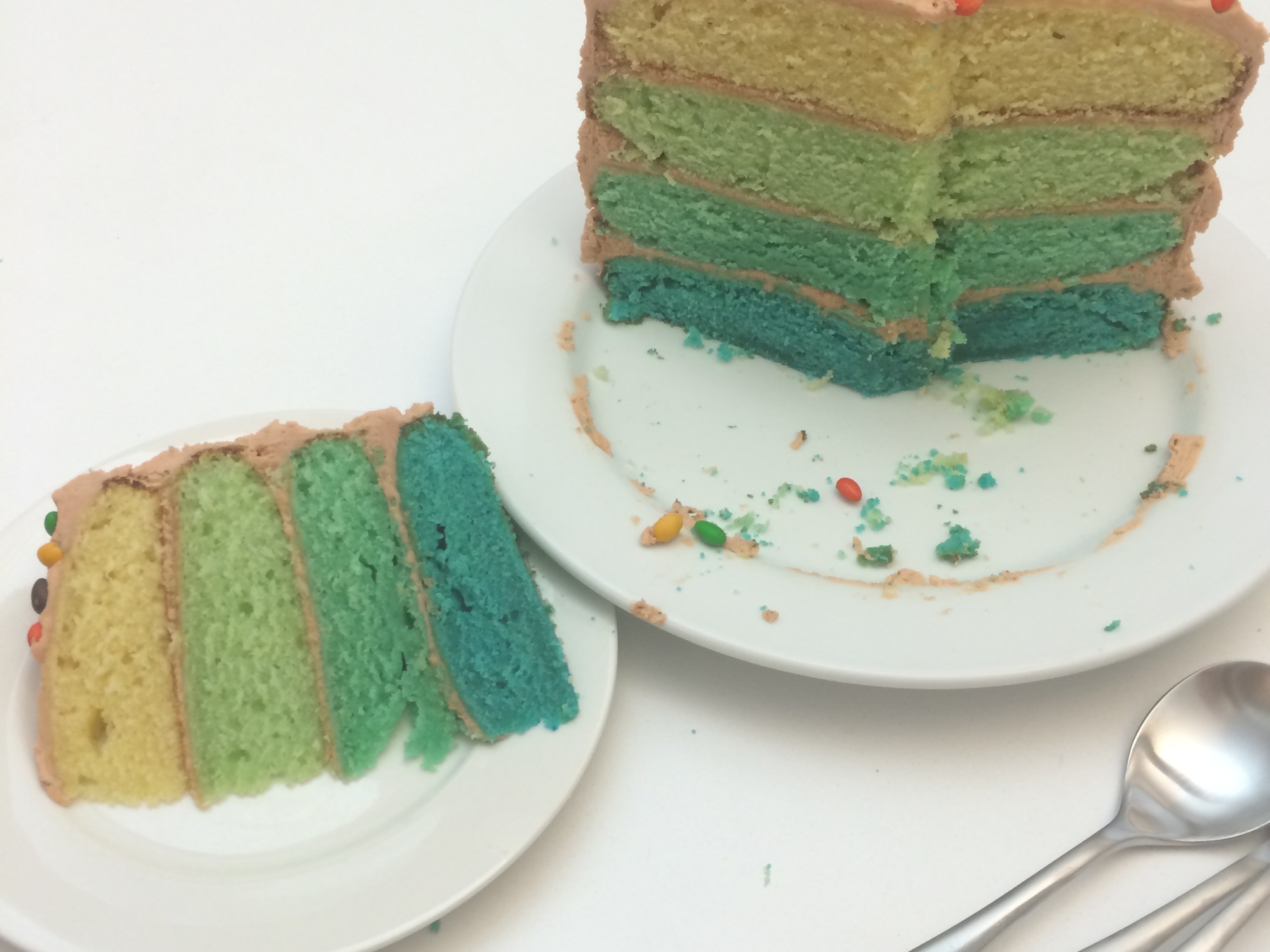 - While the first two cakes are baking, prepare the two middle layers of blue batter. Grab one of the bowls of batter and add HALF the amount of blue food colouring you added for the bluest layer. Then grab the last bowl of batter, and add half as much blue again — probably just a few drops. Mix both well and set aside until the tins are ready to reuse.