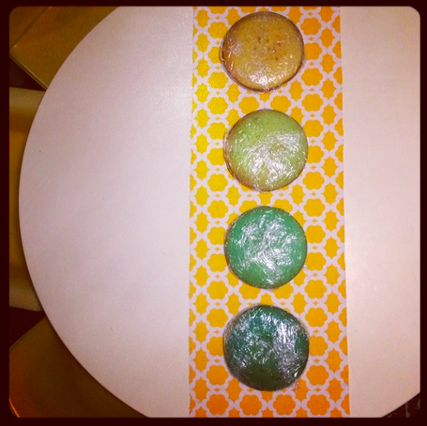 - Grab four smallish mixing bowls, and divide out the batter. I don’t bother with scales — just ladle a big scoop of batter into each bowl, one at a time, until there’s an equal amount in each bowl.