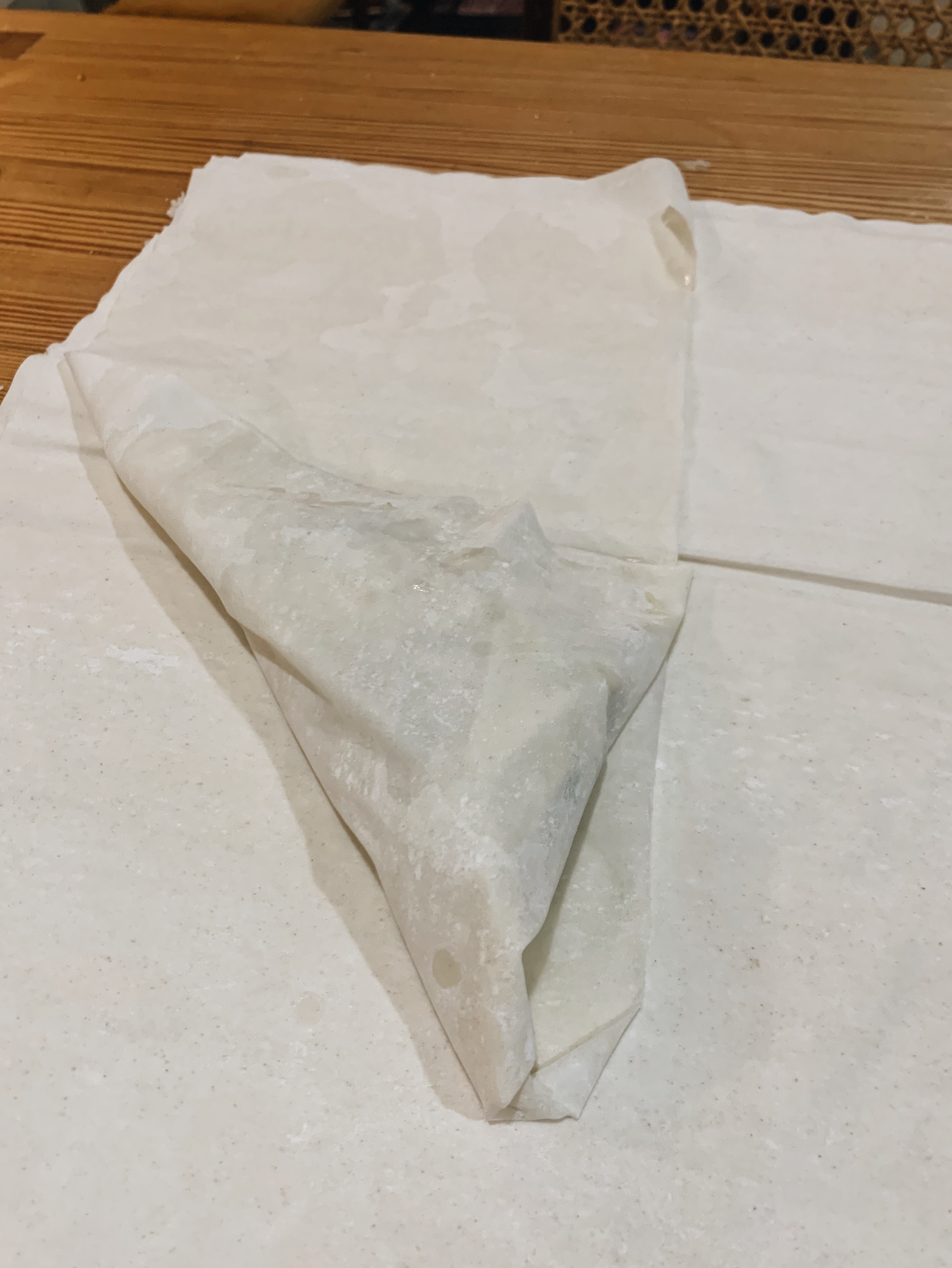 14. Carefully unroll your filo pastry onto the benchtop. Don’t separate any of the layers — you should have a stack of pastry sheets (annoyingly as thin and fragile as gold leaf) sitting on top of one plastic sheet/wrapper.