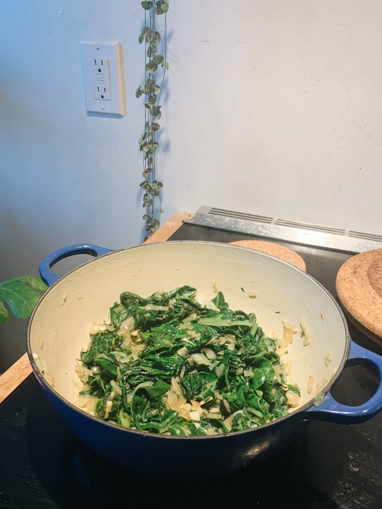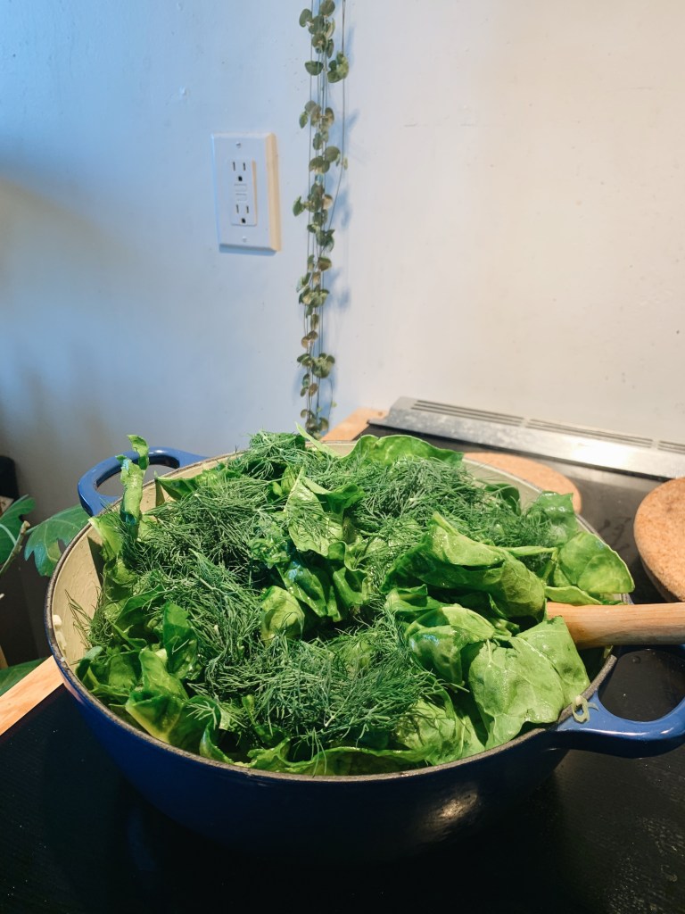 7. Add the silverbeet/chard and dill, stir gently and cover for a few minutes — this will look like an insurmountable amount of green, but it will wilt down quickly.