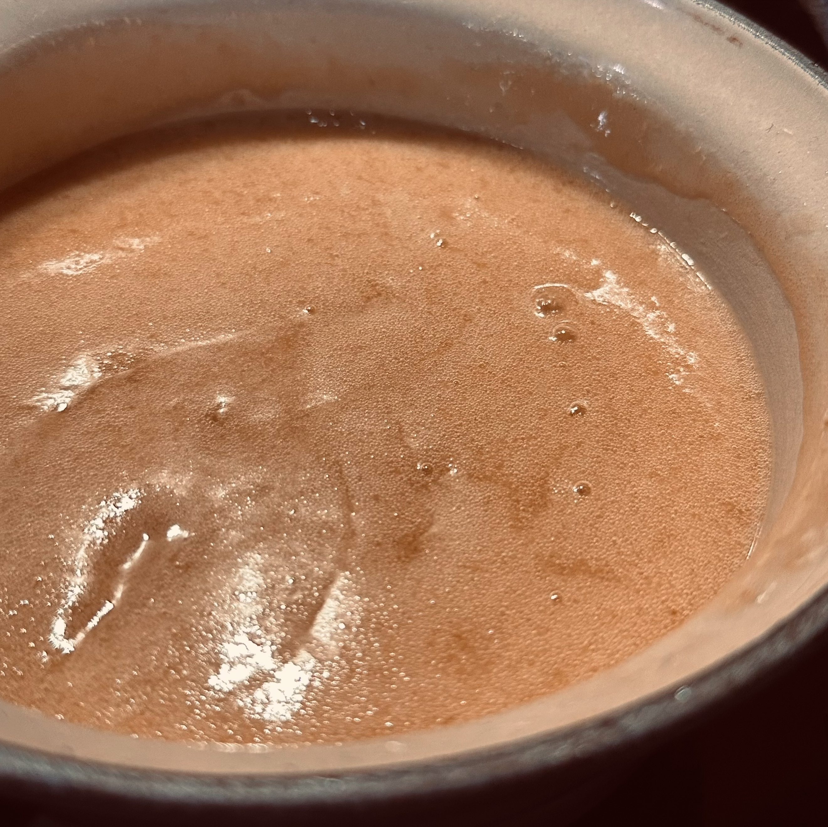 4. In a small bowl, mix the baking soda and boiling water together, then add to the saucepan and stir gently until it froths up.